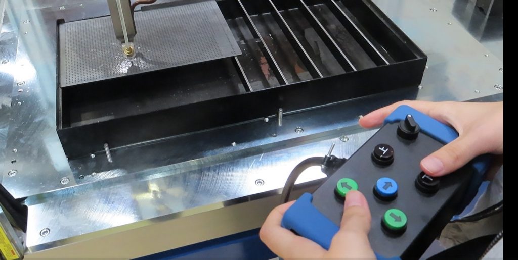 専用のペンダント十字キーで位置を合わせ、ボタンを押すだけでティーチング完了。UFOキャッチャーを操作するような感覚で誰でも直感的に扱えます