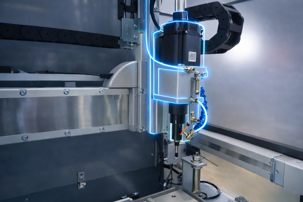 プレス下型に内蔵することによりプレス成型とタップの同時加工を可能に。高性能サーボモータ駆動により、プレス加工角度に合わせてタップストロークや送り速度をコントローラ制御。各種金属部品などを大量にプレス生産するシーンで高いパフォーマンスを発揮します。